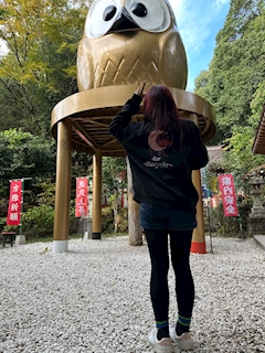 Bar Haüynite あいです🐈⬛ 先日、 ふくろう神社に行ってきました🦉 いたるところにフクロウ🦉 アウイナイトトレーナーを着用してたので、ご利益ばっちり期待です!笑 お昼ご飯は 鮎食べた🐟 4人で行ったのですが、3本食べた😂笑 10月も終わり、 11月はコスプレ➕カラオケサービス月間🥰 飼い主様、募集してます♡エンゲル係数高めです♡ この機会にお待ちしてます😘 ほんじゃまた🐈⬛